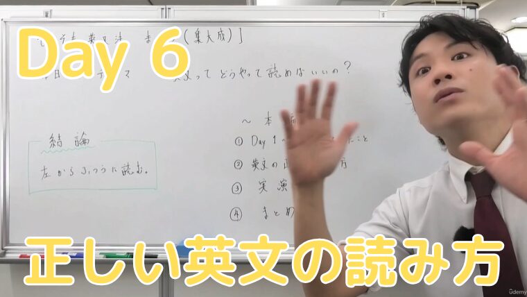 英文法のゼロイチ【Day6】そもそも英文ってどう読むの? kobetsuyasan2025 2026年3月24日 画像をクリックするとUdemyのサイトにジャンプします♪英語は必ず伸ばせます。ただ、英文法の「そもそも」を理解していない状態で学習を進めても成果は出ません。私と一緒に英文法の「ゼロ」の部分をしっかりと掴みましょう!Udemy(ユーデミー)とは世界最大級のオンライン学習プラットフォームです。英文法の「そもそも」の部分を動画でわかりやすく解説しています。英文の根本的なルールさえ掴めば英語は必ず伸ばすことができますよ♪